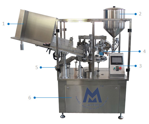 • 1.管裝:在上載之前放置空管 2.料斗:重要灌裝材料上載 3.顯示:控制機(jī)器的觸摸屏 4.工作臺(tái):所有的灌裝和封尾都在上面進(jìn)行 5.輸出通道:完成管的輸送 6.動(dòng)力箱: 包含所有的動(dòng)力部件,如電